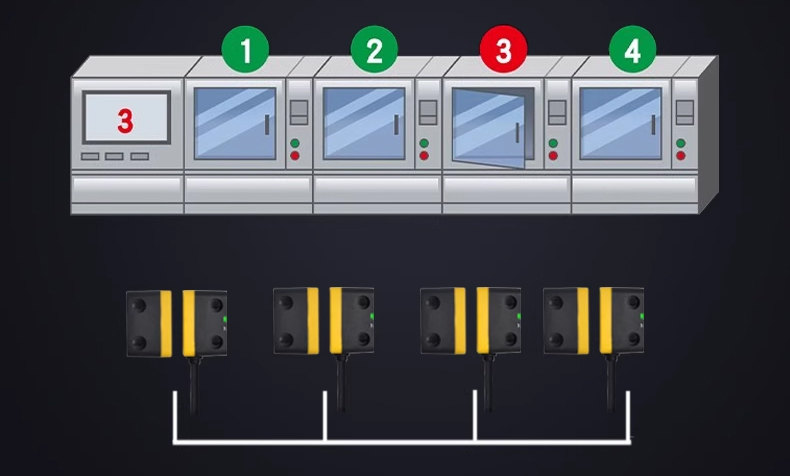 多個門通過級聯(lián)連接,可實現(xiàn)統(tǒng)一的安全輸出。確認(rèn)是否有其中一扇門的開閉狀態(tài)不正常。